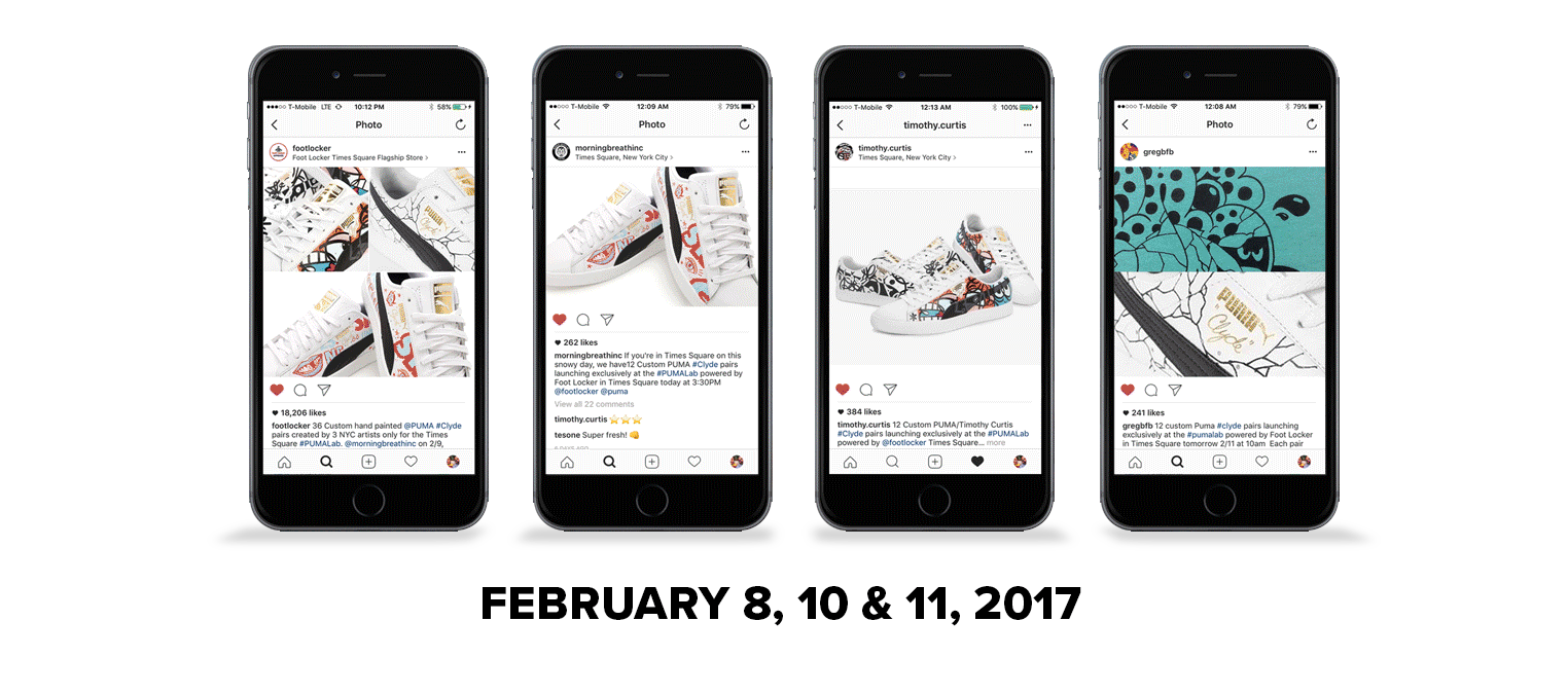 We curated artists Morning Breath, Greg LaMarche, Tim Curtis (For NYCs opening), along with Mr. Kiji and Nick Jaskey (For Puma Lab x Footlocker Detroit) to create original handmade artworks (one dozen per artist) on classic Puma Clydes.